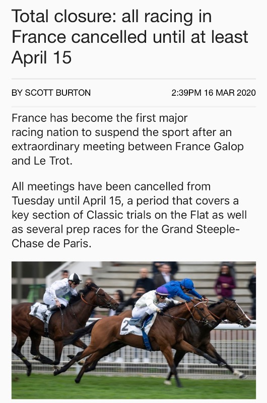 The challenge facing the UK from a racing "behind closed doors" perspective / option is that Entrance Fees to the various race tracks form a major part of their funding model. As far as I am aware, there no tracks in the UK which allow for free entrance. Clearly Japan and Hong Kong can absorb the losses incurred from a lack of entrance fees and here in South Africa there is no entrance charge in any case. Hopefully we can continue to offer racing "behind closed doors" here in South Africa without interruption but there is obviously no guarantee of that. Racing seems to be proceeding normally in Singapore, Australia and New Zealand and I am uncertain as to what may happen in the USA.