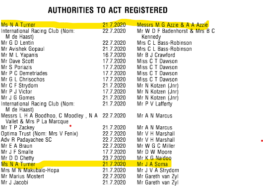 In an article on Sporting Post on 22 July, it is announced that Ms. Turner is " a registered colour holder". That is true as we can see from the authorities to act registered on 21 July 2020 at the NHA. How convenient! I would love for all concerned, in the interests of transparency, to provide proof when the horses in the Azzie and Soma stable were partly or fully owned by Ms Turner - proof of purchase and monthly stable keep receipts should be simple to provide. Why I am so suspicious is we have seen this little charade recently and it concerns recently appointed NHA board member Rosevear, who was also listed as an owner when his board announcement was made, and also strangely enough, got listed on the NHA authorities to act list that same week. Also very convenient wouldn't you think?