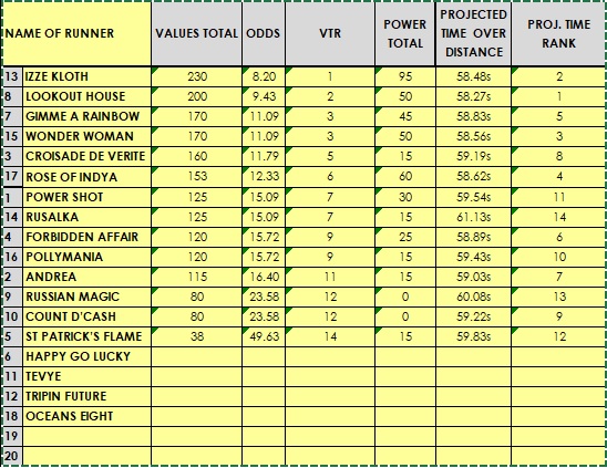 A while ago I developed a piece of software for personal use analysing RSA racing that I have used off and on. It basically totals values of a series of handicapping factors both conventional and non-conventional. Here I post, as an additional set of ratings for member's use (in addition to whatever method they use). This for Race 1. The soft underfoot conditions of course can make nonsense of any ranking system, most horses aren't iceskating candidates and the poly would have a similar kind of effect but not to the extent that rain would.