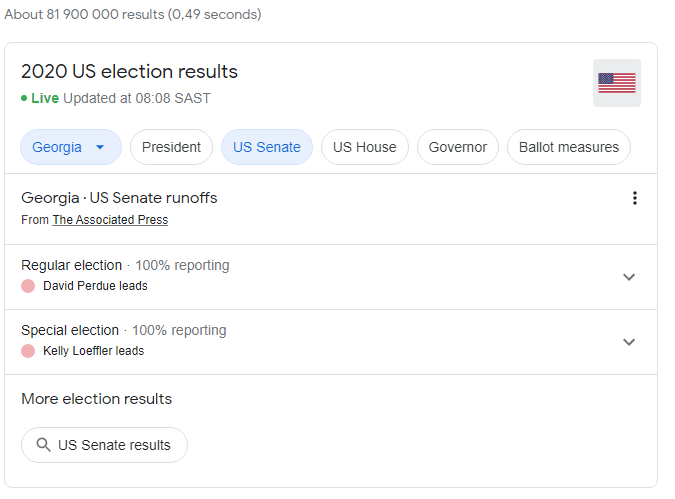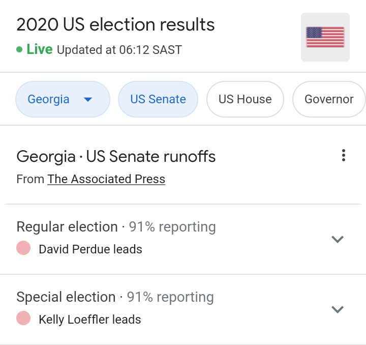 4 years 8 months agoThis is my very point, Kelly Loeffler has lost to Warnock, and Perdue and Ossoff are going neck-and-neck, Perdue slightly ahead, but the votes are still coming in.