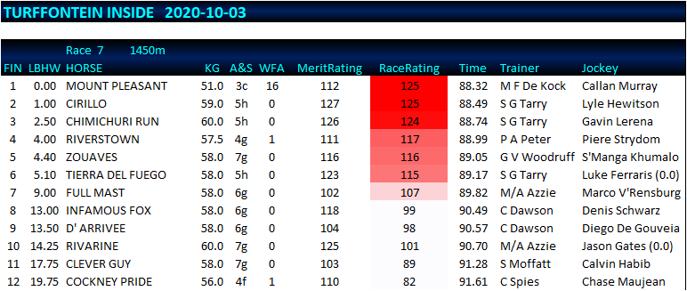 Unbeaten three-year-old MOUNT PLEASANT has had his merit rating raised from 112 to 127 after his defeat of some high class older rivals in the Grade 2 Joburg Spring Challenge over 1450m on the Turffontein inside track on Saturday 3 October. The Handicappers felt that 5th placed ZOUAVES was highly unlikely to have run below his rating in a race of this calibre and accordingly used him as the line horse. As such, his rating remains unchanged on 116.