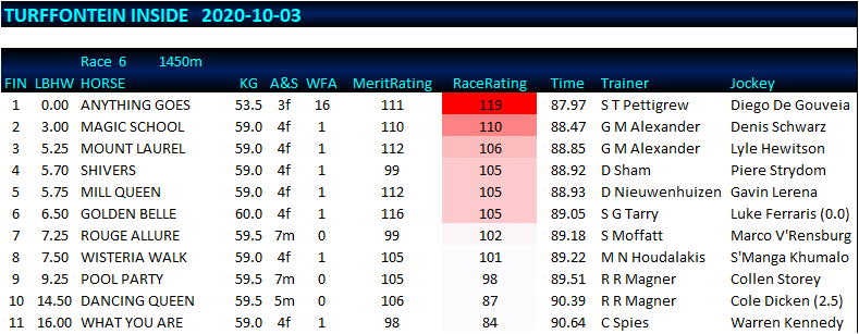 Undefeated three-year-old ANYTHING GOES has had her rating raised from 111 to 120 after she easily beat older females to win the Grade 2 Joburg Spring Fillies & Mares Challenge over 1450m on the Turffontein inside course on Saturday. Runner-up MAGIC SCHOOL was deemed to make for the best line horse when assessing this event and accordingly remains unchanged on a mark of 110.