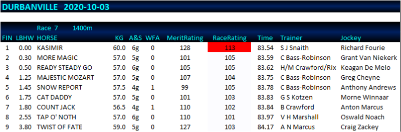 KASIMIR remains unchanged on a mark of 128 after his narrow success in the Grade 3 Matchem Stakes over 1400m at Durbanville on Saturday. The Handicappers believed that 3rd placed READY STEADY GO made for the best line horse, which leaves his rating unchanged on 105, and in assessing the race in this way KASIMIR runs only to a mark of 112.