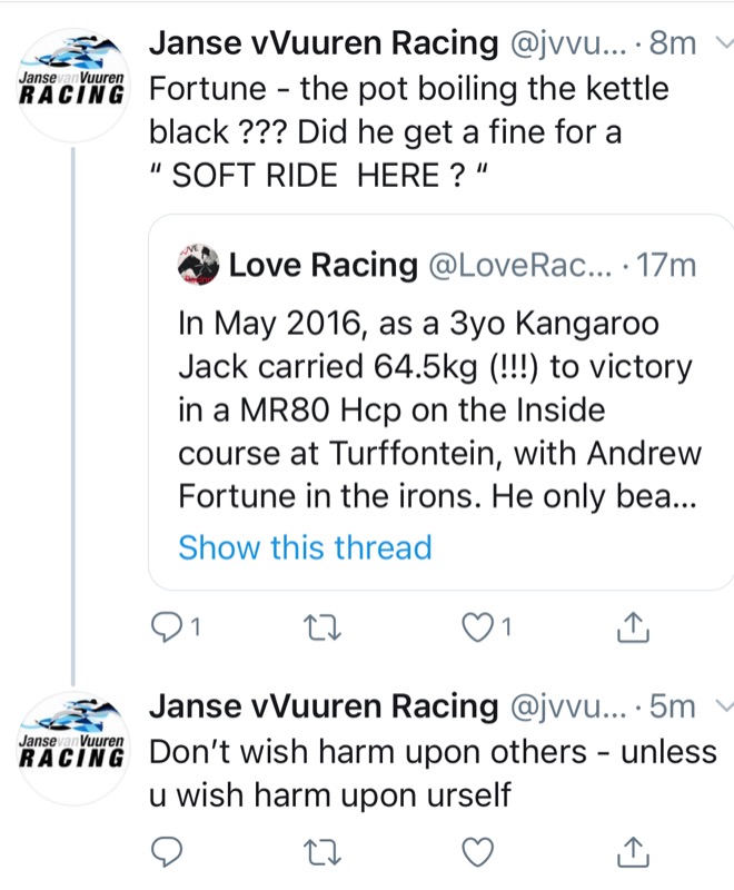 .....having the privilege of the "gift box".....I get to see all the replays and head on's on the clean feed channel daily..... and most races show the most awful stick work in the finish.....including the recent race where Anton Marcus having his stick hit from his hand.....and also top jocks Strydom Lerena Kennedy with sticks in the wrong hand.....then that gr8 chirp from Eric Fordred saying that Andrew Fortune won more races sitting no good on a horse....brilliant...but Andrew recons the intent not to win the race was obvious.....ja to a oke that was once a master....sure his chirp about him being a stipe was tongue in cheek.....or maybe he just wants to be on Vee's Christmas card list......:lol: