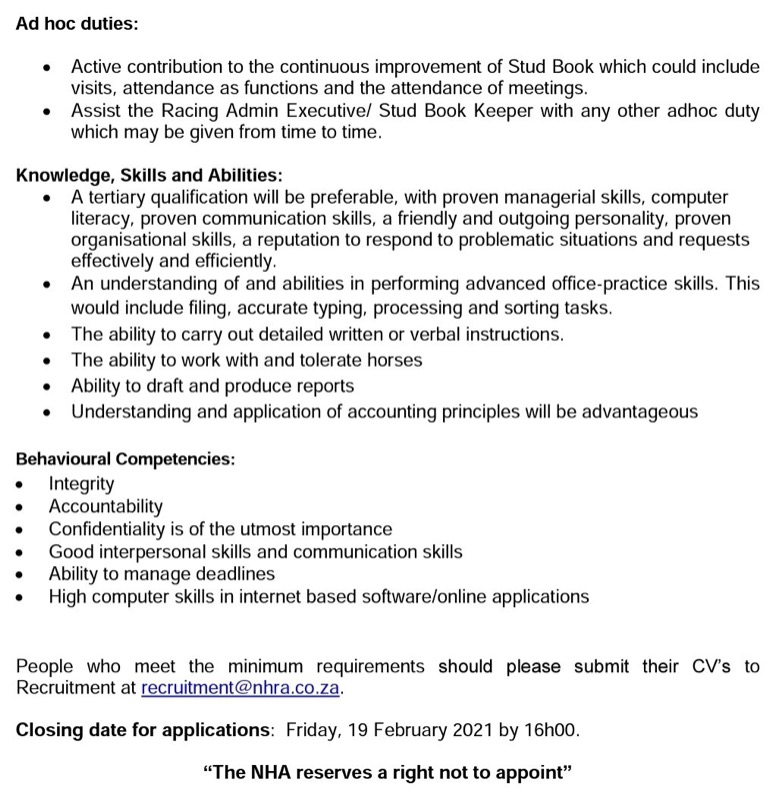 assist the RAE/ stud book keeper with any other adhoc duty which may be given from time to time.