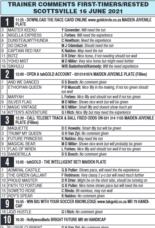 Scottsville hosts Wednesday`s South African races, it`s a 10 race card with an 11:25 start time..
