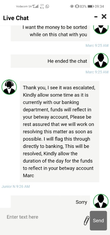 Day 6 of waiting for betway to resolve a deposit from Saturday.. Get the same generic call center lines.. :woohoo: