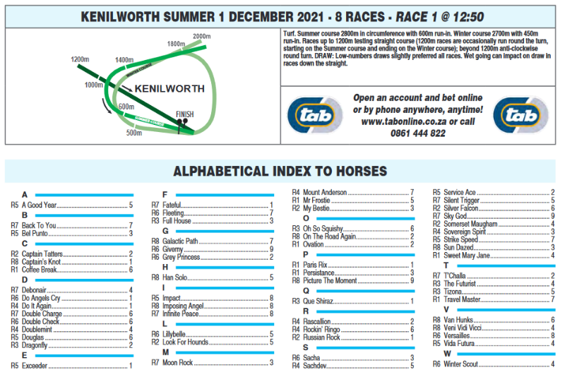 Kenilworth hosts Wednesday's South African racing action.