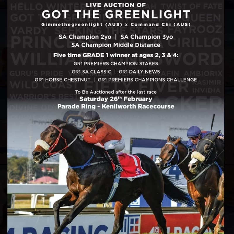 Five time Gr1 winner Got The Greenlight, a star of his generation, will be sold for stud, to dissolve a partnership, at Kenilworth Racecourse on Saturday 26 February.