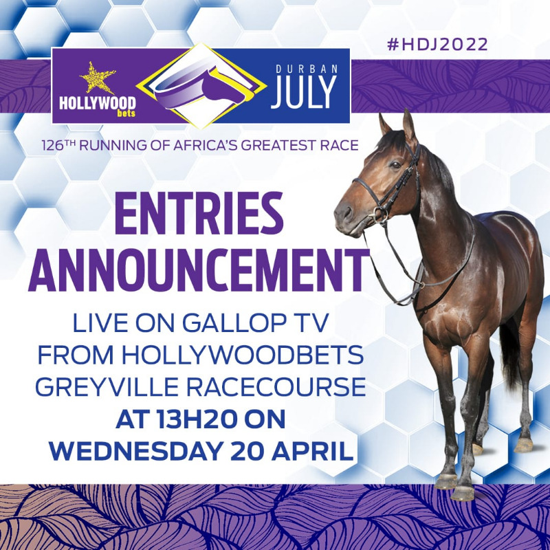 Hi clanners, tune into GallopTV at 13h20 to watch the announcement of the First Entries for the 2022 Hollywoodbets Durban July! Hosted by Graeme Hawkins, we run through the first horses that have thrown their name in the hat for Africa's Greatest Horse Race. Visit