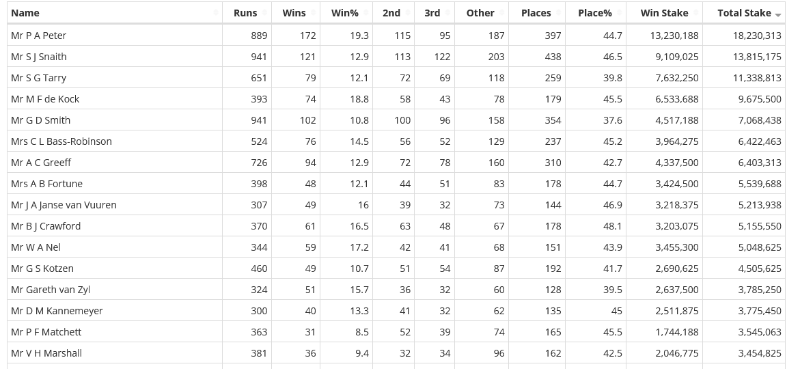 Before Derby day in the Cape Snaith was 2.2 million ahead of Paul Peter he is now 4.4 million behind him thats a swing of 6.6 million in 3 months.Paul is averaging 19.11 winners a month for the 9 months if he continues at this rate he will finish on 230 winners for the season which will be a new SA record.