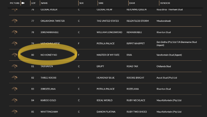 Varsfontein are agent for A Foster here but surely , if it was his choice of name, should have steered him away because of the connotation. Varsfontein have had names rejected before but that was before she was in charge.