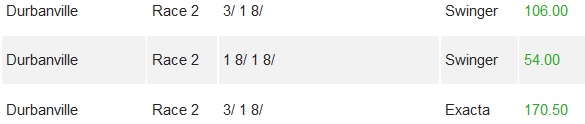 Managed to catch the exacta and all three swingers. My software had the order 3-1-8. Sigh of relief because it's not going so well at Turffontein!