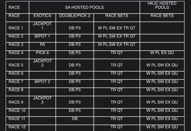 ALL RACES: Win, Place, Swinger, Exacta, Quinella (FIRST, SECOND any order -available ONLY Races 4-12), Trifecta, Quartet, Rolling Double (Races 1-2; 2-3; 3-4 etc), Pick 3 (Races 1-3; 2-4; 3-5 etc) AND BiPot One (RACES 2-7), BiPot Two (RACES 7-12), Place Accumulator (RACES 3-9), Pick 6 (RACES 4-9), Jackpot One (RACES 1-4), Jackpot Two (RACES 5-