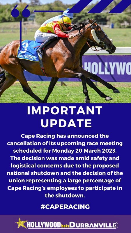 15 March 2023, Cape Town, South Africa – Cape Racing has announced the cancellation of its upcoming race meeting scheduled for Monday 20 March 2023. The decision was made amid safety and logistical concerns due to the proposed national shutdown and the decision of the union representing a large percentage of Cape Racing’s employees to participate in the shutdown.