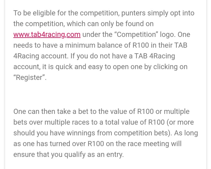 To me this is not a level playing field - as there is no fixed amount for taking part in the competition - e.g. if one successfully wagers R10,000 on a horse paying R2.00 a win, then your balance would be R20,000 - so how would this be fair when compared to a guy waging a successful bet of R100 on that horse - then your balance would be R200 - and the guy with the bigger budget would win ?
