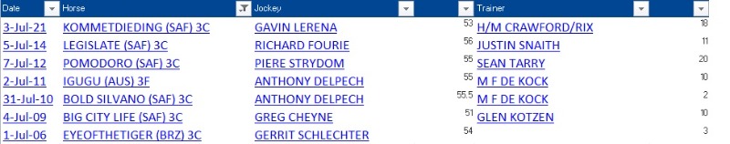 2 years 3 months agoIs it correct that no 3yr old horse has carried 56/57kg to victory in the July, in the last 30 yrs or so .. barring Legislate, who did not actually cross the line first?