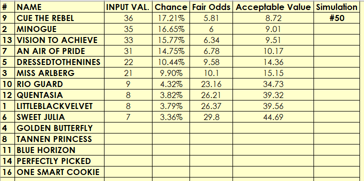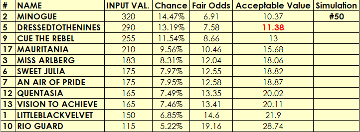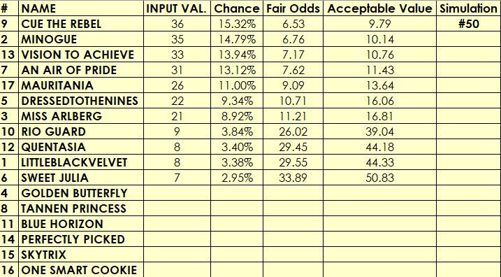 DISCLAIMER: There are NO guarantees, no promises, just a sophisticated simulation that spits out FAIR ODDS and my own version of ACCEPTABLE ODDS that is a minimum 50% above FAIR ODDS value (you can decide on your own acceptable value odds). See my example above for Race 2. This is for fun and there are no promises you will make money. You use the information at your own risk. 50% overlay (above my FAIR ODDS calculation) is the compensation I need for finding a value bet(s). Some players are willing to take less. I need to offset Tote takeout (35%?) and/or bookies tax of +-6%.