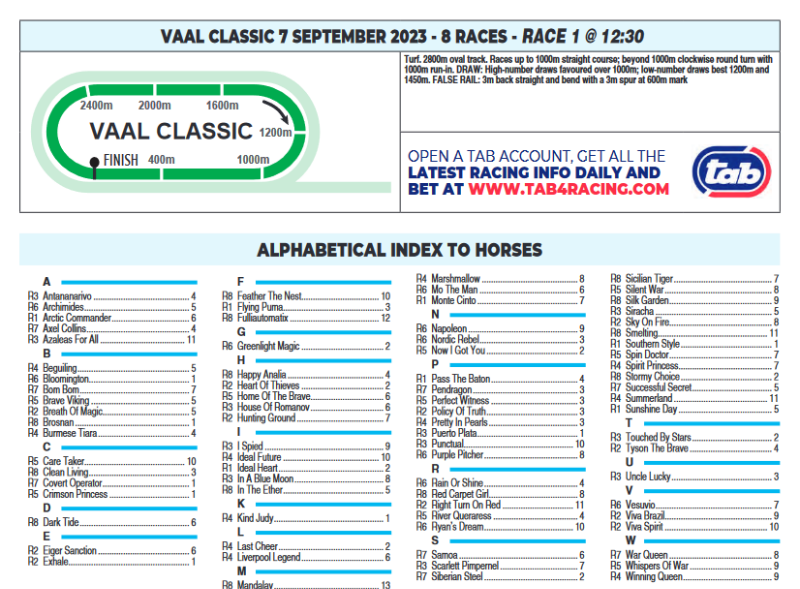 Preview: HOUSE OF ROMANOV (6) made a fine Highveld debut and should relish the step up in trip. SCARLETT PIMPERNEL (7) ran well when stepped up to 1600m and should also enjoy the step up in trip. PUERTO PLATA (1) has a wide draw but in his penultimate start he went close over course and distance from the identical draw. (David Thiselton 6-7-1)