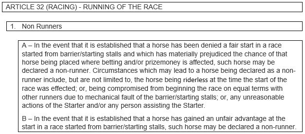 Bob as per my previous post Hong Kong declares any horse riderless at the start of a race a non runner. I did ask to get a response from Mr Vee Moodley in this regard as he mentioned Hong Kong. Can we get a response.