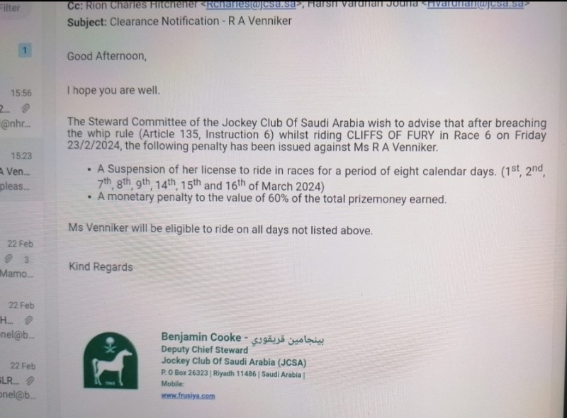 Re: Saudi Cup and Rachel Venniker