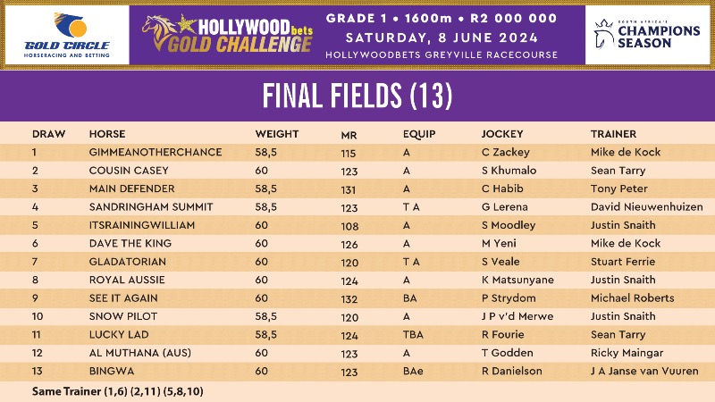 Lucky Lad, sensational winner of the Golden Horse Sprint, has been declared to run just seven days later in this weekend's R2-million Hollywoodbets Gold Challenge (Gr1) over 1600m. He joins fellow leading 3yo's Sandringham Summit, Main Defender and Snow Pilot in the final field of 13 runners in what promises to be a thrilling renewal of South Africa's highest rated race.