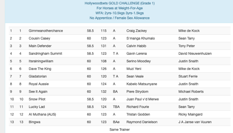 Add in to the mix, the re-appearance of See It Again, recent IOS Drill Hall Stakes winner, Royal Aussie, as well as the resurgent Cousin Casey and Dave The King, we have all the ingredients for a memorable Hollywoodbets Gold Challenge. Certainly a race not to be missed - a mouthwatering classic match between the country's top 3yo's and the leading lights of the older generations.