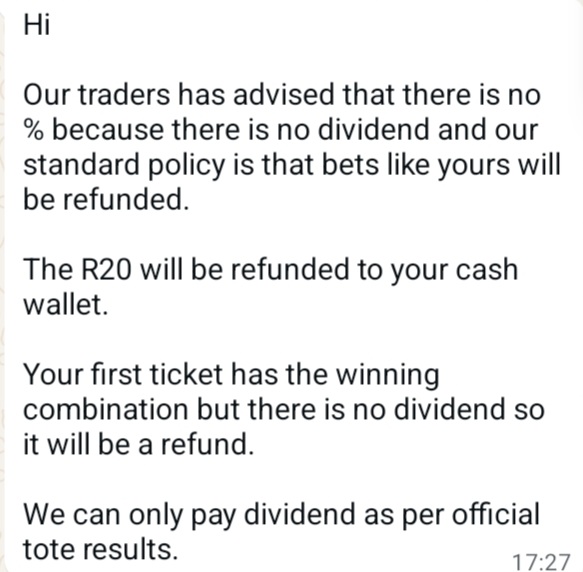All bookies have it in thier ts and cs. Essentially if you take 20% of the P6 and catch it but no one who played on the tote does you get refunded not paid out 20% of the pool. Hw and betway allow you to play straight into the tote pools however it seems one isnt able to play the daily comp it seems for that you have to play on tab direct.