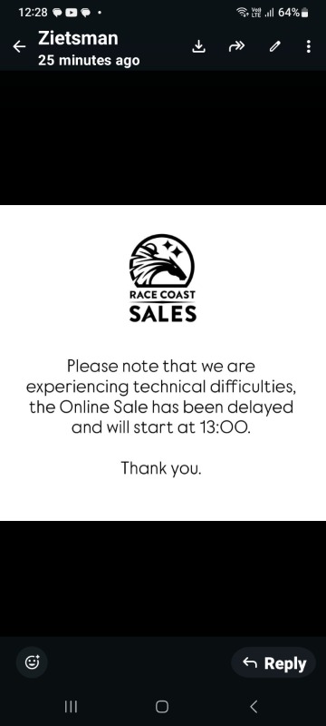 Race Coast Sales advises that the January online sale experienced a technical issue related to the external host server, which temporarily affected bidding reliability. The issue has now been resolved, and steps have been taken to ensure a smooth and reliable bidding process. As a result, the January online sale will be delayed until Friday 30 January 2026 commencing at 09:00 with the sale starting at 13:00. All previous bids have been voided, and prospective buyers will need to place their bids again when the sale resumes. Race Coast Sales thanks customers for their patience and understanding and appreciates the strong support shown for the sale. For more information please contact: Pippa Mickleburgh pippa@racecoast.co.za Vicky Minott vicky@racecoast.co.za MJ Byleveld mj@racecoast.co.za