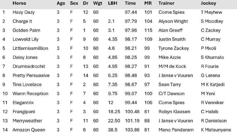 The three year old daughter of Act Of War was bred by the Breedon Stud Close Corporation and campaigns in the interests of Mr D Dasrath & Mrs C Dasrath, Messrs R P Macnab, S Poriazis, Vikash Sobaren, X Spies & D Vayapuri. She is trained by Corne Spies and has forged a successful partnership with Trent Mayhew, who has been aboard for 4 of her 6 career wins, including the Gr3 Ducat Africa Fillies Mile on Betway Summer Cup day 2025. Hazy Dazy now has 5 wins and a place from 7 career starts.
