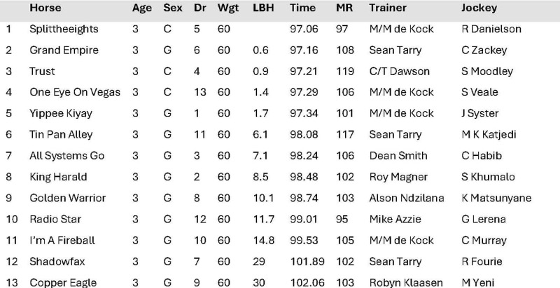 Gauteng Guineas Day 2025 was the scene of Mike and Mathew de Kock’s newly minted partnership’s first feature race title with Spumante Dolce in the 2025 Wilgerbosdrift Gauteng Fillies Guineas under Raymond Danielson. Today, they repeated the feat in the TAB Gauteng Guineas with Splittheeights (Vercingetorix). The 3yo colt displayed courage and class to deliver a first Gr2 win forJayson and Preshalin Murugasa. Well-supported to start 5-2 second favourite, Mike and Mathew de Kock-trained Splittheeights got to the front in the final 50m with Raymond Danielson in the irons to beat Grand Empire and Craig Zackey by 0.60 lengths. Third place was awarded to 9-4 favourite Trust after an objection with another De Kock runner, One Eye On Vegas (25-2), relegated to fourth. Bred by Ridgemont Highlands, the half-brother to William Robertson was a R600k purchase from the BSA August 2yo Sale, and now has 3 wins and 2 places from 5 career starts.