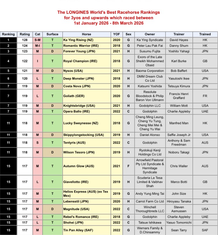 1 month 4 days agoStill you have to wonder - Ka Ying Rising 'only' 128 .... and Tin Pan Alley 117 ....Misleading as it's only the horses that have run from 1 Jan...so all the top European and British horses not even out yet ..Â